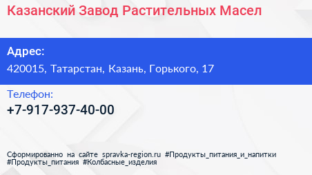 Казанский Завод Растительных Масел по адресу 420015, Татарстан, Казань, Горького, 17 в дальнейшем Организация, размещена в следующих категориях: