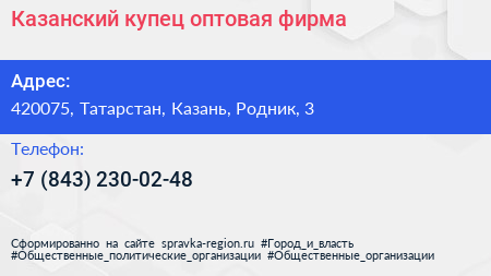 Казанский купец, оптовая фирма по адресу 420075, Татарстан, Казань, Родник, 3 в дальнейшем Организация, размещена в следующих категориях: