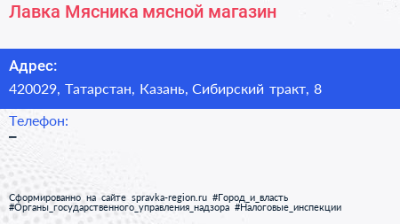 Лавка Мясника, мясной магазин по адресу 420029, Татарстан, Казань, Сибирский тракт, 8 в дальнейшем Организация, размещена в следующих категориях: