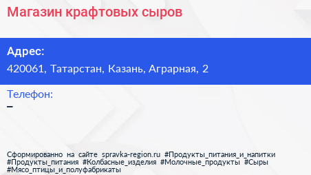 Магазин крафтовых сыров по адресу 420061, Татарстан, Казань, Аграрная, 2 в дальнейшем Организация, размещена в следующих категориях: