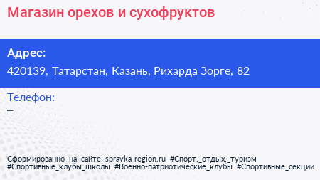 Магазин орехов и сухофруктов по адресу 420139, Татарстан, Казань, Рихарда Зорге, 82 в дальнейшем Организация, размещена в следующих категориях: