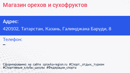 Магазин орехов и сухофруктов по адресу 420102, Татарстан, Казань, Галимджана Баруди, 8 в дальнейшем Организация, размещена в следующих категориях: