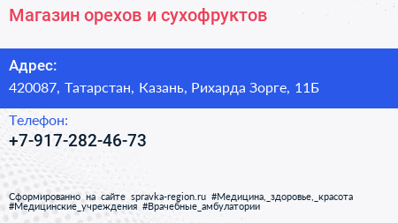 Магазин орехов и сухофруктов по адресу 420087, Татарстан, Казань, Рихарда Зорге, 11Б в дальнейшем Организация, размещена в следующих категориях: