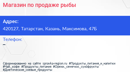 Магазин по продаже рыбы по адресу 420127, Татарстан, Казань, Максимова, 47Б в дальнейшем Организация, размещена в следующих категориях: