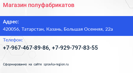 Магазин полуфабрикатов по адресу 420056, Татарстан, Казань, Большая Осенняя, 22а в дальнейшем Организация, размещена в следующих категориях: