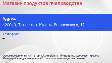 Магазин продуктов пчеловодства по адресу 420043, Татарстан, Казань, Вишневского, 12 в дальнейшем Организация, размещена в следующих категориях: