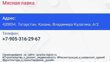Мясная лавка по адресу 420054, Татарстан, Казань, Владимира Кулагина, 6/2 в дальнейшем Организация, размещена в следующих категориях: