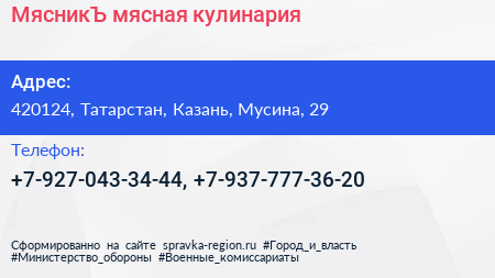 МясникЪ, мясная кулинария по адресу 420124, Татарстан, Казань, Мусина, 29 в дальнейшем Организация, размещена в следующих категориях: