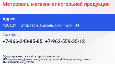 Метрополь, магазин алкогольной продукции по адресу 420129, Татарстан, Казань, Кул Гали, 34 в дальнейшем Организация, размещена в следующих категориях: