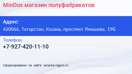 MinDus, магазин полуфабрикатов по адресу 420066, Татарстан, Казань, проспект Ямашева, 19Б в дальнейшем Организация, размещена в следующих категориях: