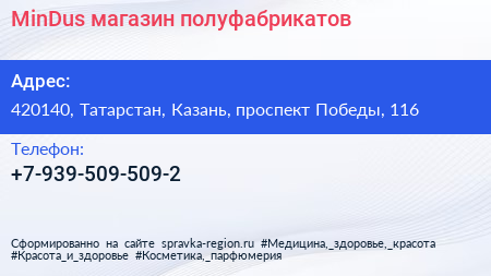 MinDus, магазин полуфабрикатов по адресу 420140, Татарстан, Казань, проспект Победы, 116 в дальнейшем Организация, размещена в следующих категориях:
