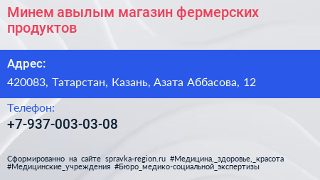 Минем авылым, магазин фермерских продуктов по адресу 420083, Татарстан, Казань, Азата Аббасова, 12 в дальнейшем Организация, размещена в следующих категориях: