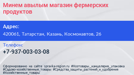 Минем авылым, магазин фермерских продуктов по адресу 420061, Татарстан, Казань, Космонавтов, 26 в дальнейшем Организация, размещена в следующих категориях: