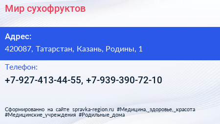 Мир сухофруктов по адресу 420087, Татарстан, Казань, Родины, 1 в дальнейшем Организация, размещена в следующих категориях: