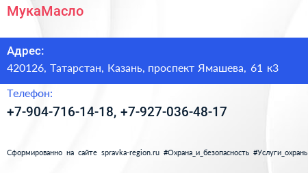 МукаМасло по адресу 420126, Татарстан, Казань, проспект Ямашева, 61 к3 в дальнейшем Организация, размещена в следующих категориях: