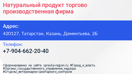 Натуральный продукт, торгово-производственная фирма по адресу 420127, Татарстан, Казань, Дементьева, 2Б в дальнейшем Организация, размещена в следующих категориях:
