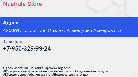 Nuahule Store по адресу 420061, Татарстан, Казань, Разведчика Ахмерова, 5 в дальнейшем Организация, размещена в следующих категориях: