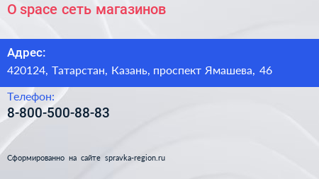 O: spaсe, сеть магазинов по адресу 420124, Татарстан, Казань, проспект Ямашева, 46 в дальнейшем Организация, размещена в следующих категориях: