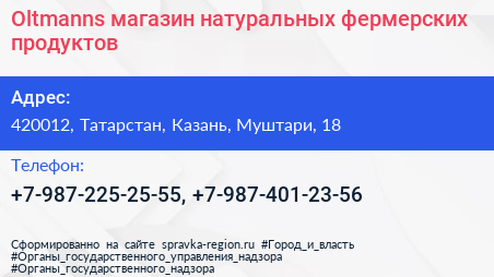 Oltmanns, магазин натуральных фермерских продуктов по адресу 420012, Татарстан, Казань, Муштари, 18 в дальнейшем Организация, размещена в следующих категориях: