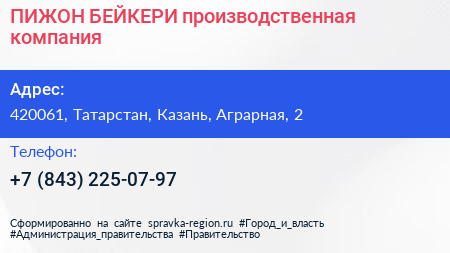 ПИЖОН БЕЙКЕРИ, производственная компания по адресу 420061, Татарстан, Казань, Аграрная, 2 в дальнейшем Организация, размещена в следующих категориях: