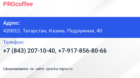 PROcoffee по адресу 420015, Татарстан, Казань, Подлужная, 40 в дальнейшем Организация, размещена в следующих категориях: