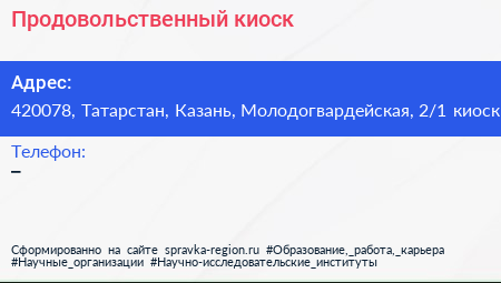 Продовольственный киоск по адресу 420078, Татарстан, Казань, Молодогвардейская, 2/1 киоск в дальнейшем Организация, размещена в следующих категориях: