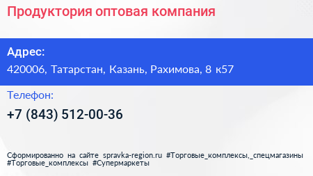 Продуктория, оптовая компания по адресу 420006, Татарстан, Казань, Рахимова, 8 к57 в дальнейшем Организация, размещена в следующих категориях: