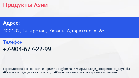 Продукты Азии по адресу 420132, Татарстан, Казань, Адоратского, 65 в дальнейшем Организация, размещена в следующих категориях: