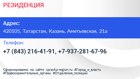 РЕЗИДЕНЦИЯ по адресу 420105, Татарстан, Казань, Аметьевская, 21а в дальнейшем Организация, размещена в следующих категориях: