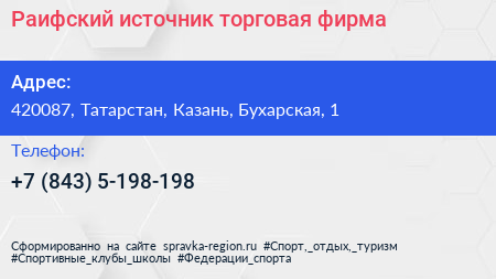 Раифский источник, торговая фирма по адресу 420087, Татарстан, Казань, Бухарская, 1 в дальнейшем Организация, размещена в следующих категориях: