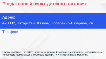 Раздаточный пункт детского питания по адресу 420032, Татарстан, Казань, Поперечно-Базарная, 74 в дальнейшем Организация, размещена в следующих категориях: