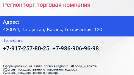 РегионТорг, торговая компания по адресу 420054, Татарстан, Казань, Техническая, 120 в дальнейшем Организация, размещена в следующих категориях: