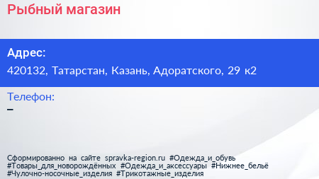 Рыбный магазин по адресу 420132, Татарстан, Казань, Адоратского, 29 к2 в дальнейшем Организация, размещена в следующих категориях:
