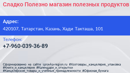 Сладко Полезно, магазин полезных продуктов по адресу 420107, Татарстан, Казань, Хади Такташа, 101 в дальнейшем Организация, размещена в следующих категориях: