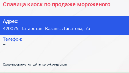 Славица, киоск по продаже мороженого по адресу 420075, Татарстан, Казань, Липатова, 7а в дальнейшем Организация, размещена в следующих категориях: