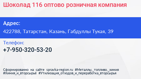 Шоколад 116, оптово-розничная компания по адресу 422788, Татарстан, Казань, Габдуллы Тукая, 39 в дальнейшем Организация, размещена в следующих категориях: