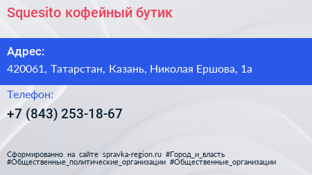 Squesito, кофейный бутик по адресу 420061, Татарстан, Казань, Николая Ершова, 1а в дальнейшем Организация, размещена в следующих категориях: