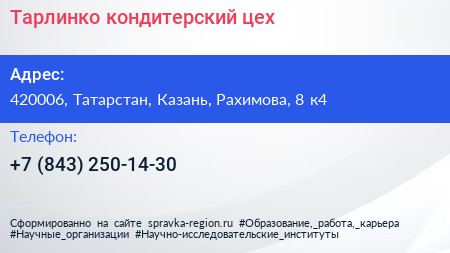 Тарлинко, кондитерский цех по адресу 420006, Татарстан, Казань, Рахимова, 8 к4 в дальнейшем Организация, размещена в следующих категориях: