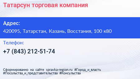 Татарсун, торговая компания по адресу 420095, Татарстан, Казань, Восстания, 100 к80 в дальнейшем Организация, размещена в следующих категориях: