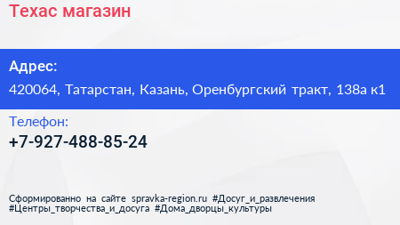 Техас, магазин по адресу 420064, Татарстан, Казань, Оренбургский тракт, 138а к1 в дальнейшем Организация, размещена в следующих категориях:
