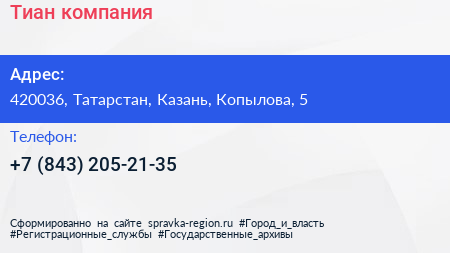 Тиан, компания по адресу 420036, Татарстан, Казань, Копылова, 5 в дальнейшем Организация, размещена в следующих категориях: