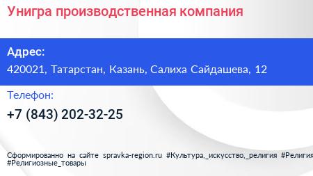 Унигра, производственная компания по адресу 420021, Татарстан, Казань, Салиха Сайдашева, 12 в дальнейшем Организация, размещена в следующих категориях: