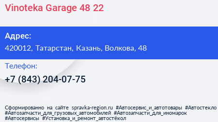 Vinoteka Garage 48/22 по адресу 420012, Татарстан, Казань, Волкова, 48 в дальнейшем Организация, размещена в следующих категориях: