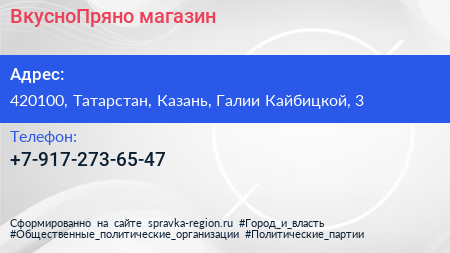 ВкусноПряно, магазин по адресу 420100, Татарстан, Казань, Галии Кайбицкой, 3 в дальнейшем Организация, размещена в следующих категориях: