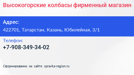 Высокогорские колбасы, фирменный магазин по адресу 422701, Татарстан, Казань, Юбилейная, 3/1 в дальнейшем Организация, размещена в следующих категориях: