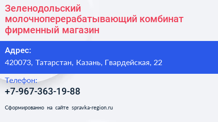 Зеленодольский молочноперерабатывающий комбинат, фирменный магазин по адресу 420073, Татарстан, Казань, Гвардейская, 22 в дальнейшем Организация, размещена в следующих категориях: