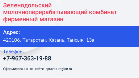 Зеленодольский молочноперерабатывающий комбинат, фирменный магазин по адресу 420106, Татарстан, Казань, Тансык, 13а в дальнейшем Организация, размещена в следующих категориях:
