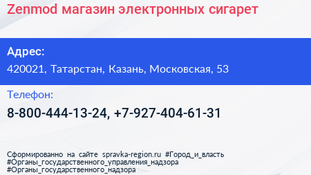 Zenmod, магазин электронных сигарет по адресу 420021, Татарстан, Казань, Московская, 53 в дальнейшем Организация, размещена в следующих категориях: