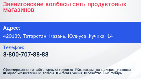 Звениговские колбасы, сеть продуктовых магазинов по адресу 420139, Татарстан, Казань, Юлиуса Фучика, 14 в дальнейшем Организация, размещена в следующих категориях: