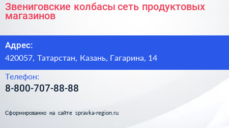 Звениговские колбасы, сеть продуктовых магазинов по адресу 420057, Татарстан, Казань, Гагарина, 14 в дальнейшем Организация, размещена в следующих категориях: